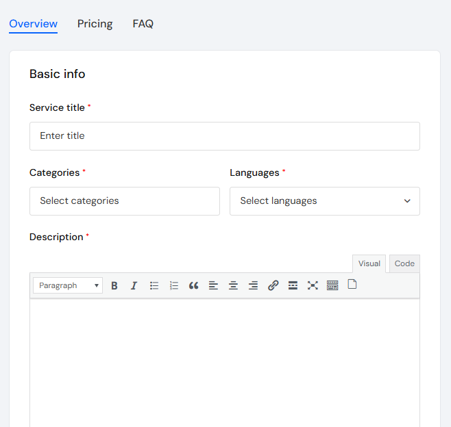 - Upload images (max 512 KB) and a video URL to showcase your work.