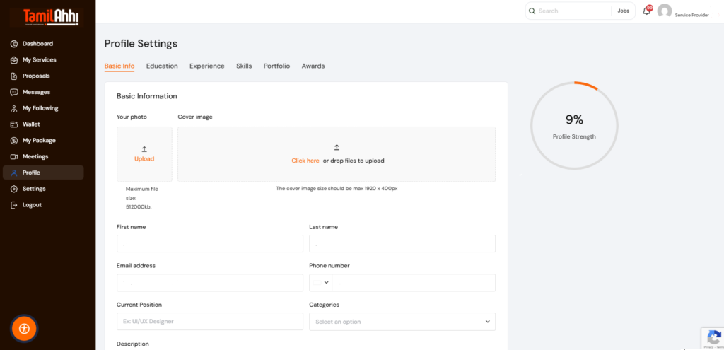 Once you've signed up, you'll be taken to the profile settings page to fill in your details.